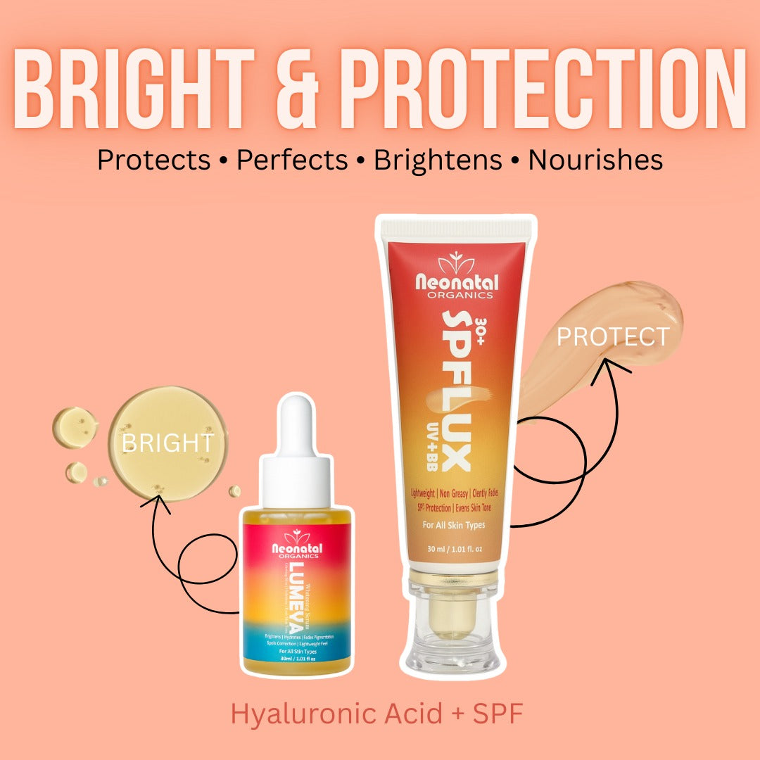 Powered by Hyaluronic Acid + SPF, this bundle deeply hydrates, shields from sun damage, evens tone, and leaves skin glowing & nourished.